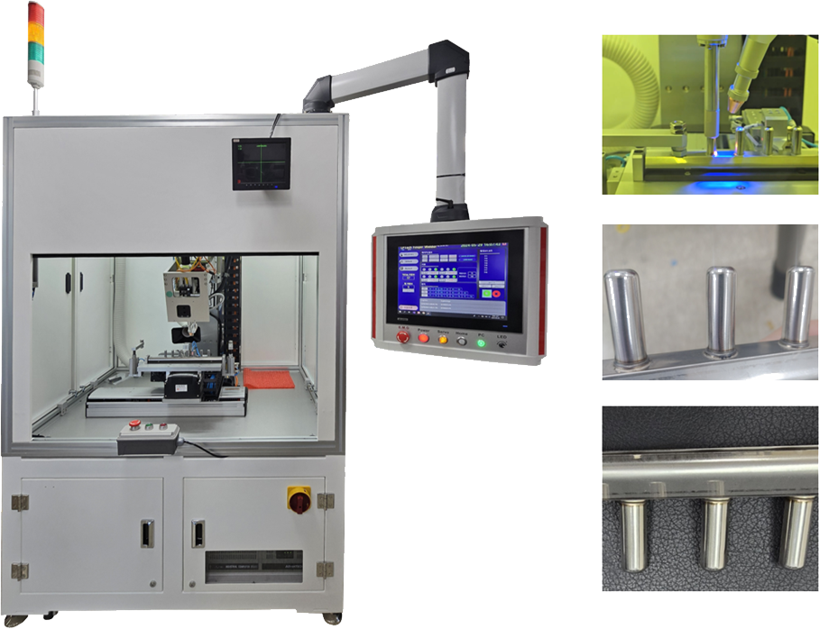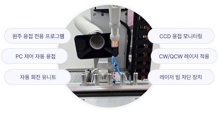 - 기본 구성 : 서보 4축 직교 로봇 / 레이저 / 회전 유니트 및 지그 / 전용 용접 헤드 / CCD 모니터링부 / 통합 제어반