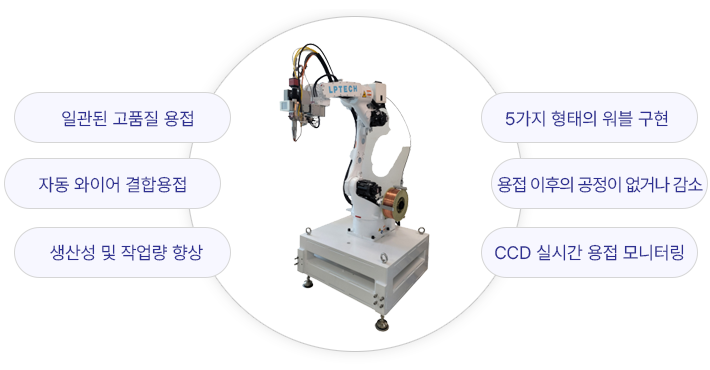 LPT-FLRWS는 일관되고 빠른 용접과 함께, 자동 와이어 결합 용접으로 다양한 형태와 재질에 대하여 로봇 용접이 가능하게 하며 정확한 용접위치와 적은 용접 열 발생으로 용접물의 변형을 최소화하고 열 영향 층이 적어서 전통적인 용접보다 후 공정인 연삭, 연마의 공정이 최소화되어 생산성이 향상되고 스크랩이 감소됩니다.