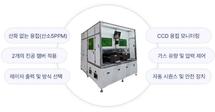 - 기본 구성 : 구동부 / 파이버 레이저 / 진공 시스템 / 전용 용접 헤드 / CCD 모니터링부 / 통합 제어반